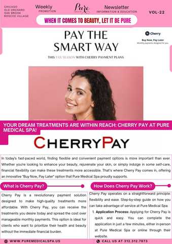 In today’s fast-paced world, finding flexible and convenient payment options is more important than ever. Whether you’re looking to enhance your beauty, rejuvenate your skin, or simply indulge in some self-care, financial flexibility can make these treatments more accessible. That’s where Cherry Pay comes in, offering an innovative “Buy Now, Pay Later” option that Pure Medical Spa proudly supports.
