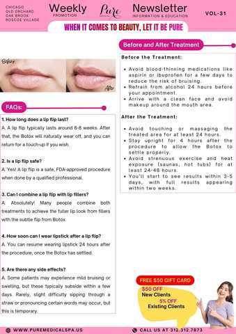 Are you looking to enhance your lips without committing to full lip filler treatments? A Lip Flip might be the perfect solution for you! In this newsletter, we’ll dive into what a lip flip is, the benefits, common myths, and what to expect before and after treatment. Plus, we’ve included some FAQs to clear up any lingering questions.